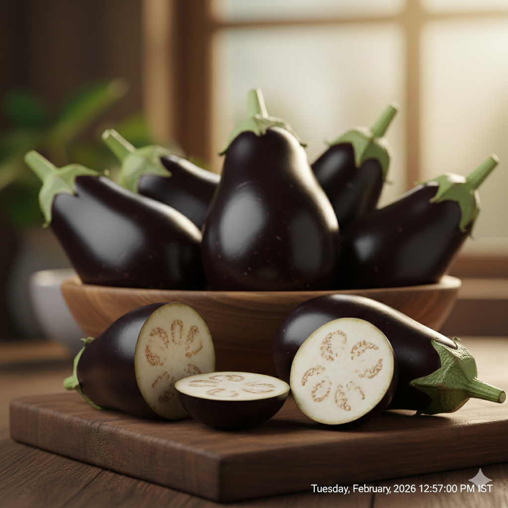 A collection of fresh, teardrop-shaped brinjals. Several whole vegetables are gathered in a wooden bowl, while one in the foreground has been sliced into thick rounds to reveal the inside.