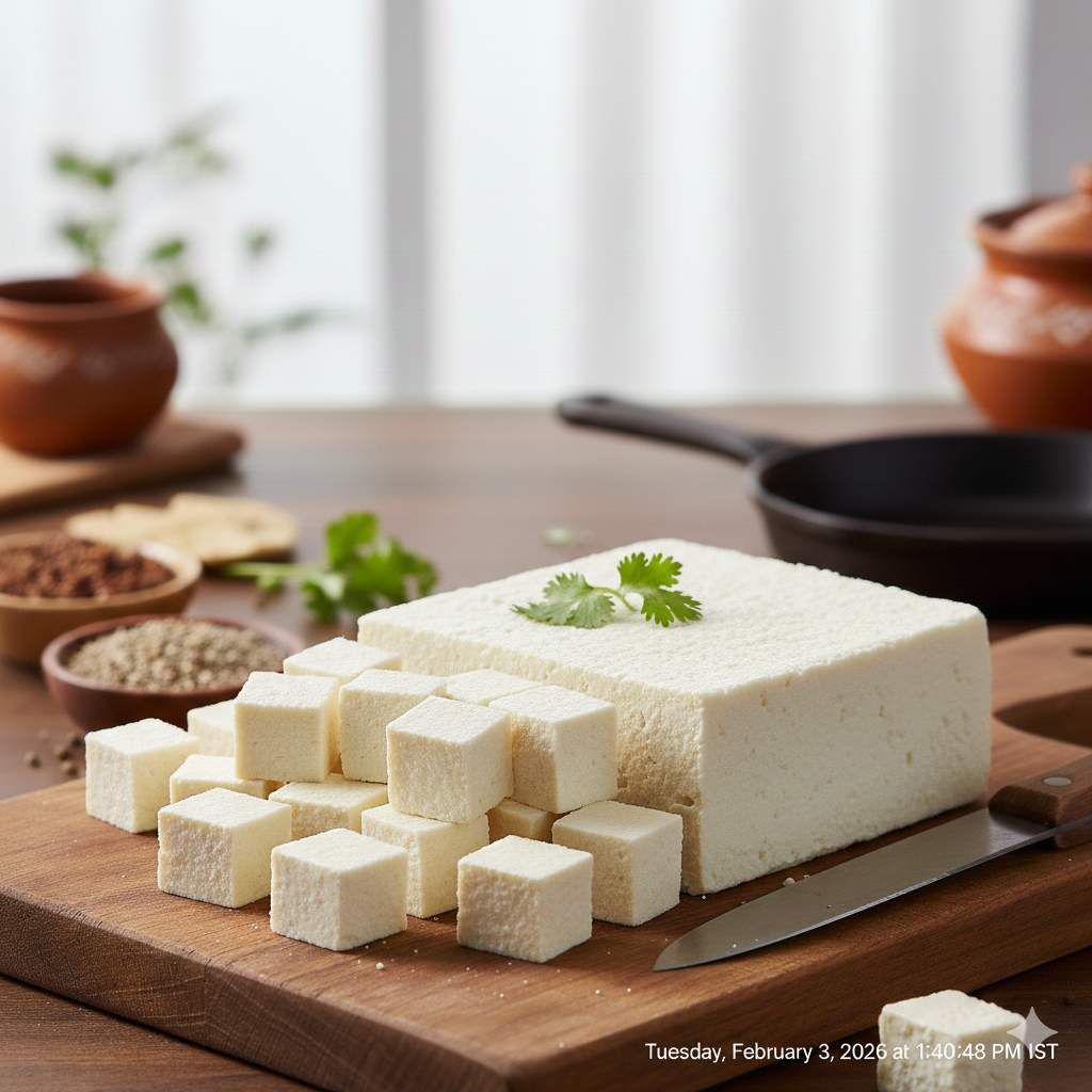 A large, solid rectangular block of creamy white paneer sits on a rustic wooden cutting board. Next to it is a generous pile of multiple uniform cubes, showing how the paneer looks once it has been sliced and prepped.