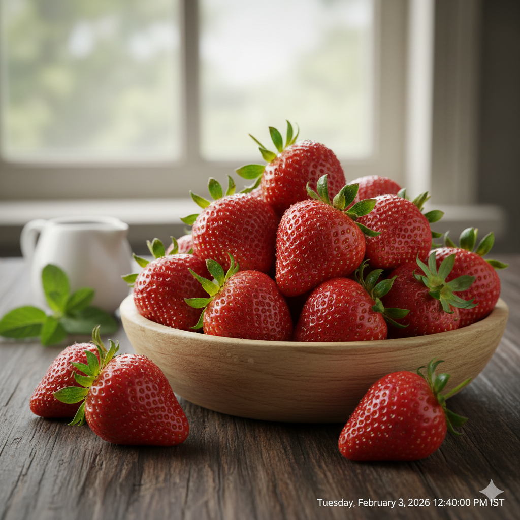 A generous heap of ripe strawberries. Most are gathered inside a light-colored wooden bowl, while three additional strawberries sit on the dark wooden tabletop in the foreground.