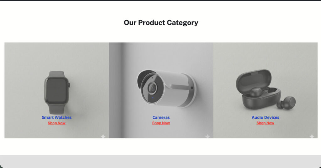 The category layout is designed to help users quickly understand the range of tech products available. Categories are clearly defined and visually separated, allowing users to navigate efficiently between different product types such as smart devices, accessories, and electronics.